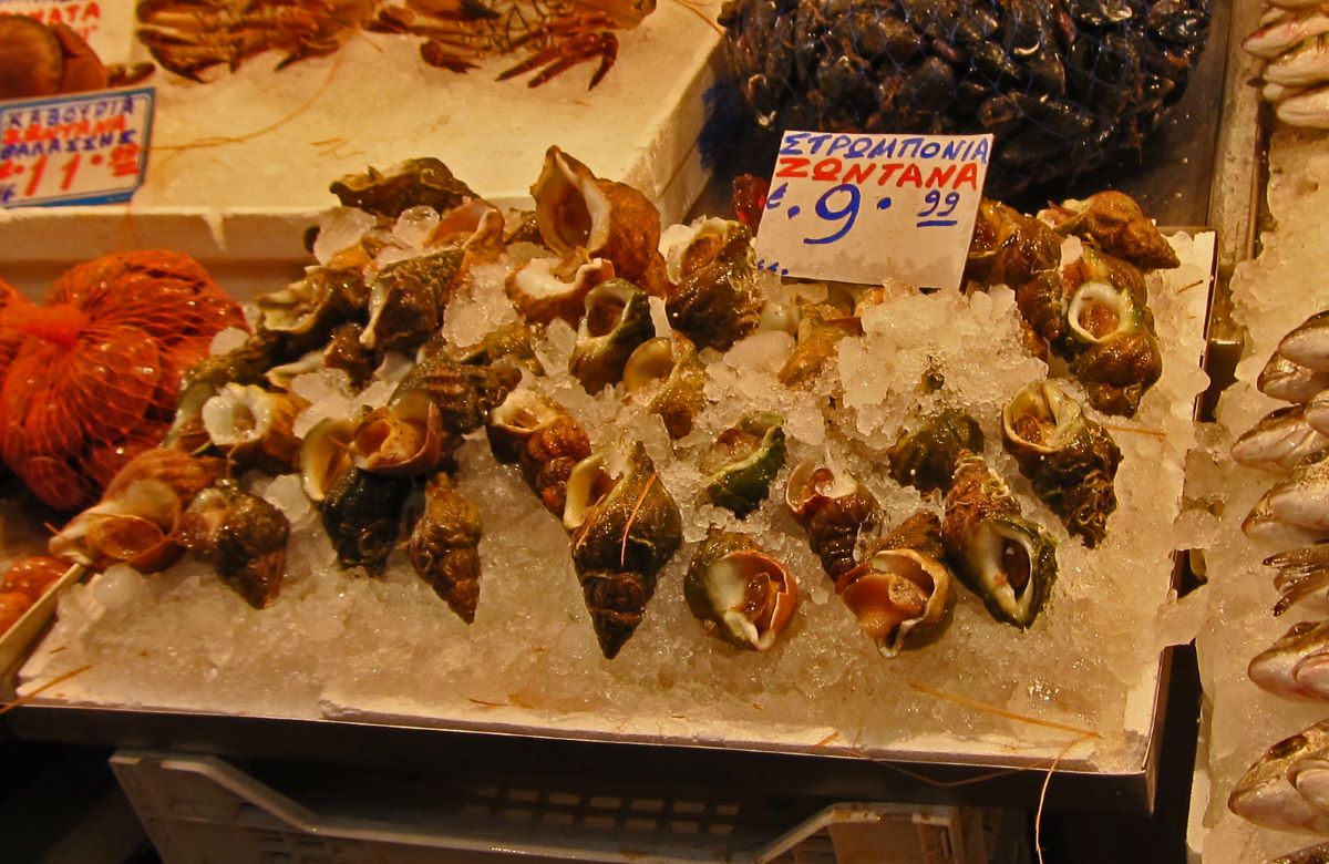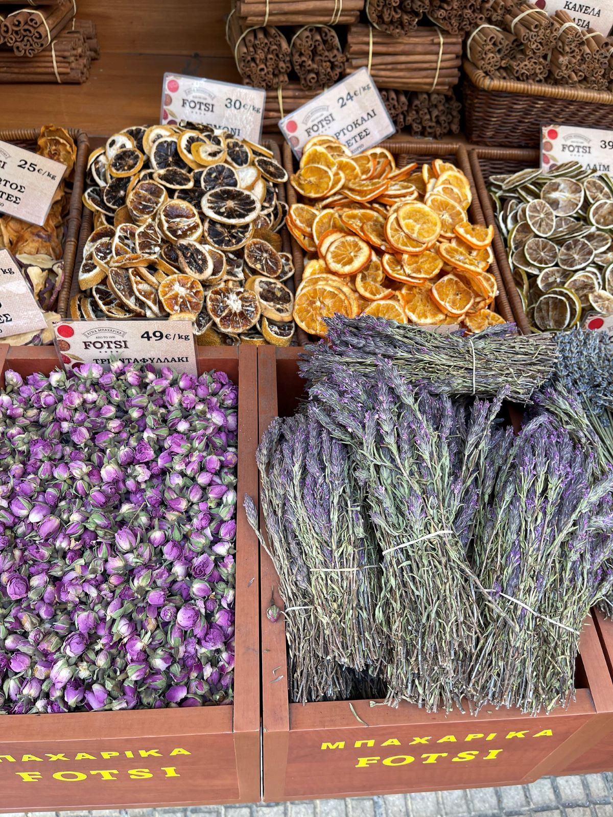 Spices and Dried Goods: Beside the fish market and behind the vegetable stalls, are several shops with massive glass jars and sacks of every kind of herb or spice you can imagine. These shops are fragrant with Paprika, Cumin, Thyme, and dried mountain tea. Amidst the spices are often dried beans, lentils and fruits, nuts, flours and any other dried product needed for your kitchen. We recommend getting some Greek oregano, sourced from nearby mountains and with a bit of a kick!