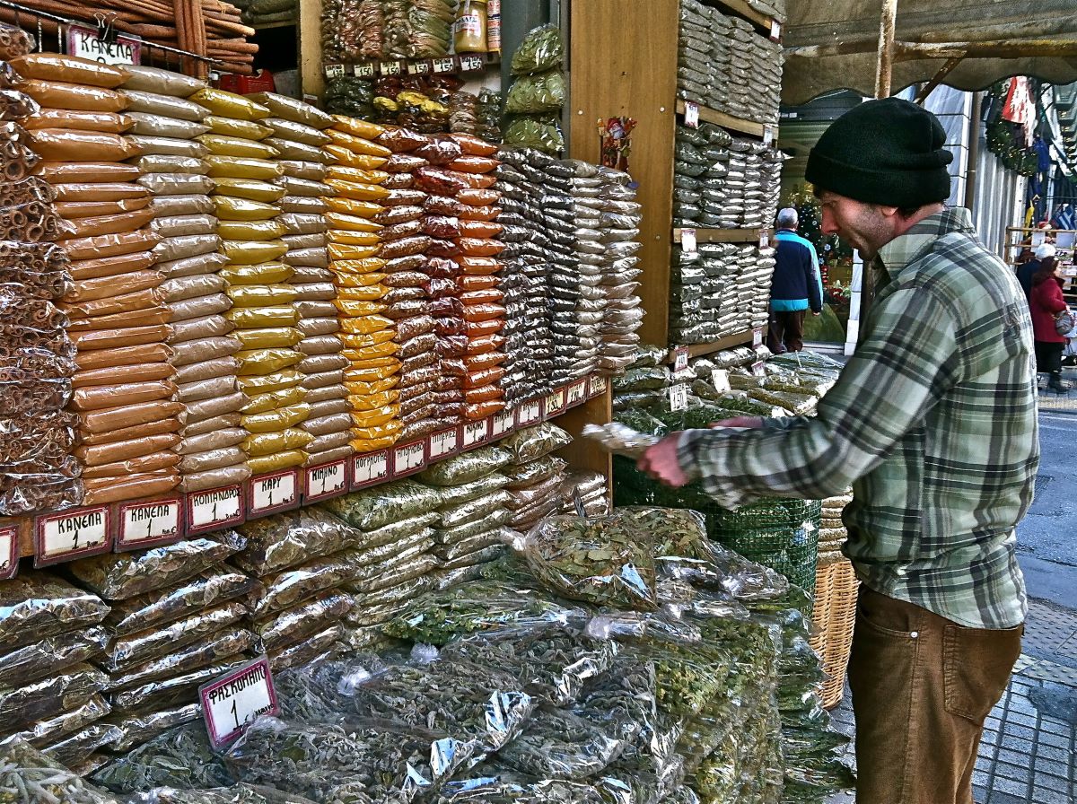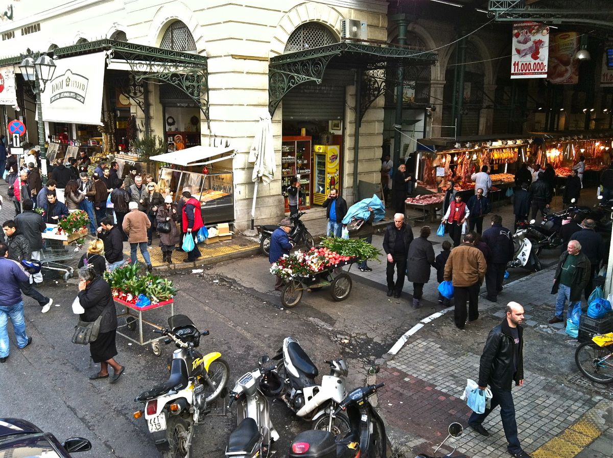 The Athens Central Market is a broad open-air market where vendors sell almost everything–all kinds of fresh fruits and vegetables, spices, teas, olive oils, honey, dried goods, local fish, butchery cuts, pots, pans, hand-woven carpets, vintage and light-fixtures.